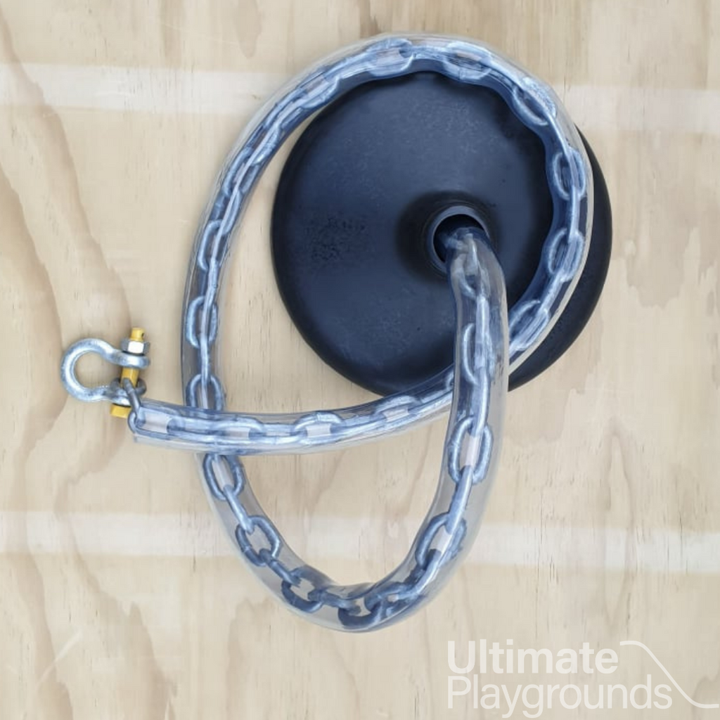 The Seat is attached to the Flying Fox Trolley via 1.5 m length 6 mm Galvanised Chain covered with Heavy Duty Plastic Sleeve (for a more comfortable Grip, and eliminating the danger of little fingers getting pinched within chain links), 1 tonne rated Bow Shackle at one end of chain, and one S Hook permanently attached at the other end .